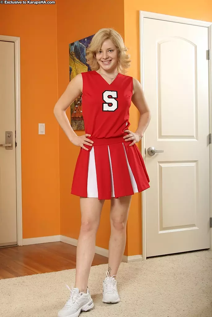 Ally Ann в красной униформе чирлидерши и белых трусиках показывает безволосую юную киску — Ally Ann