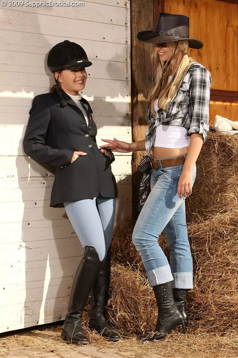Девушки в одежде жокеев Mya Sapphic и Aneta J снимают свои узкие джинсы чтобы поиграть с узенькими кисками — Aneta J