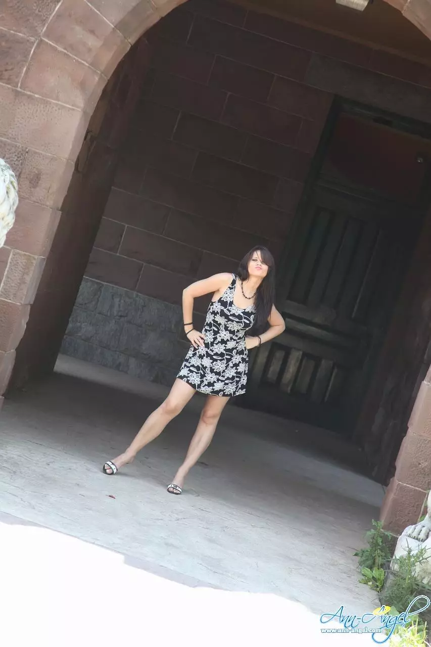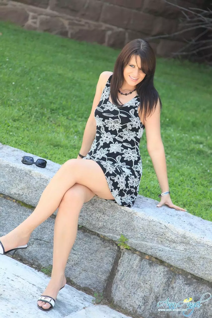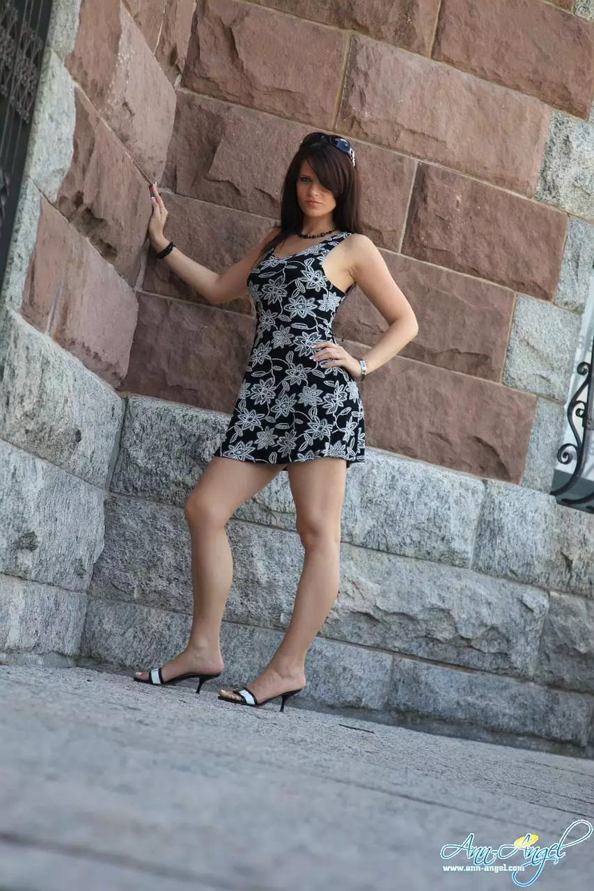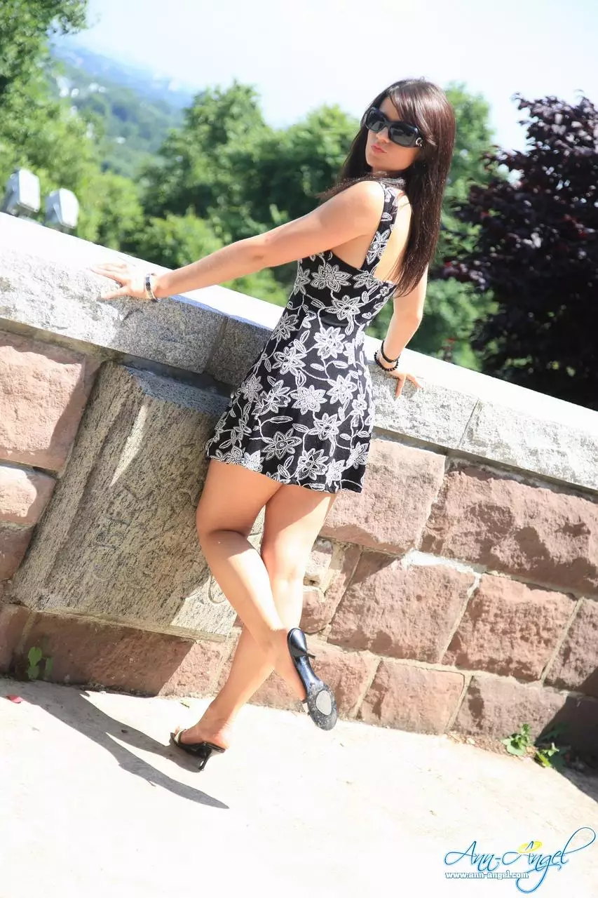 Ann Angel в миниатюрно маленькой летней одежде показывает ножки и засвечивает трусики на открытом воздухе — Ann Angel