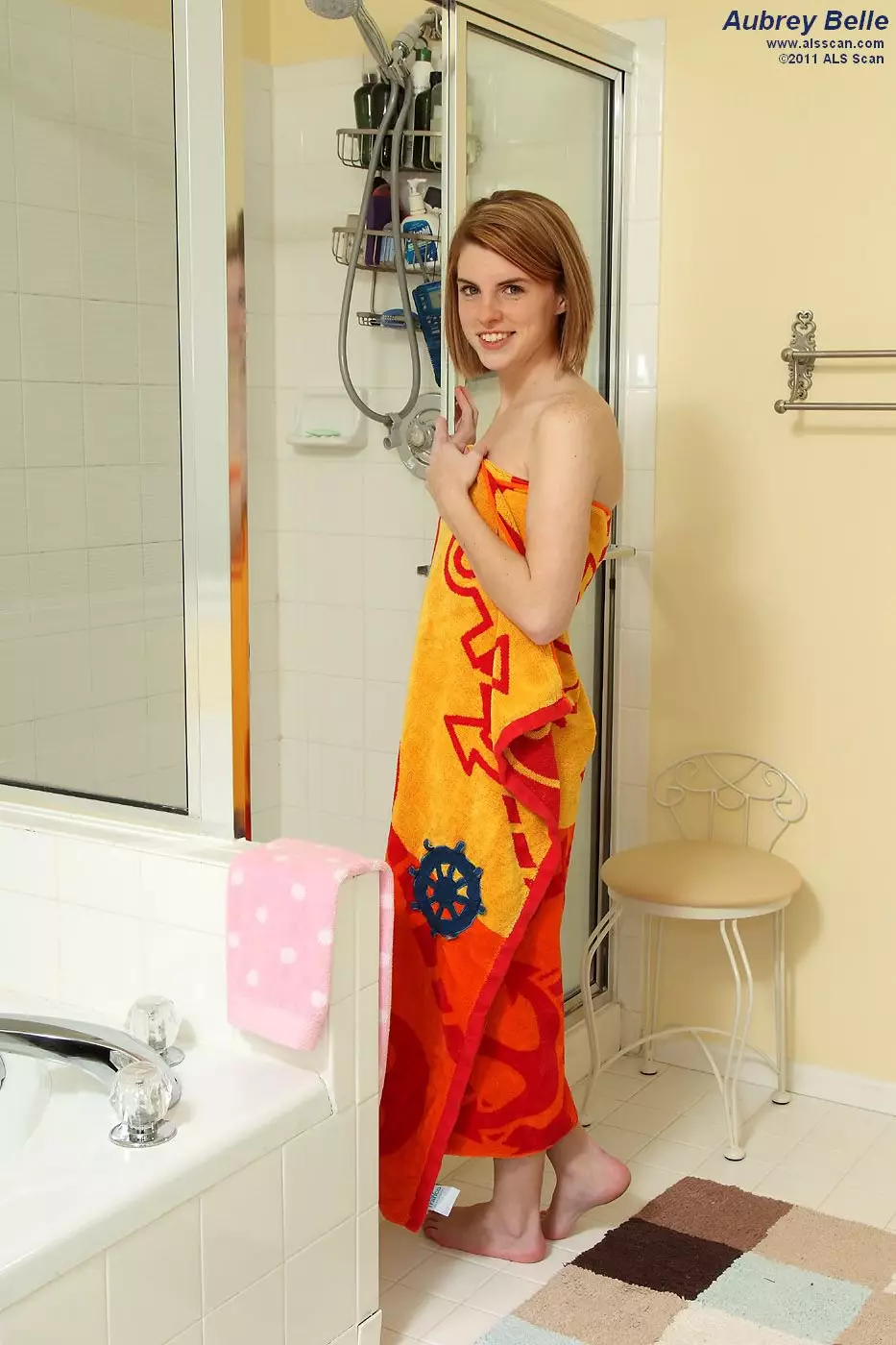 Гладкая плоскогрудая юная девушка Aubrey Belle мастурбирует в ванной комнате — Aubrey Belle