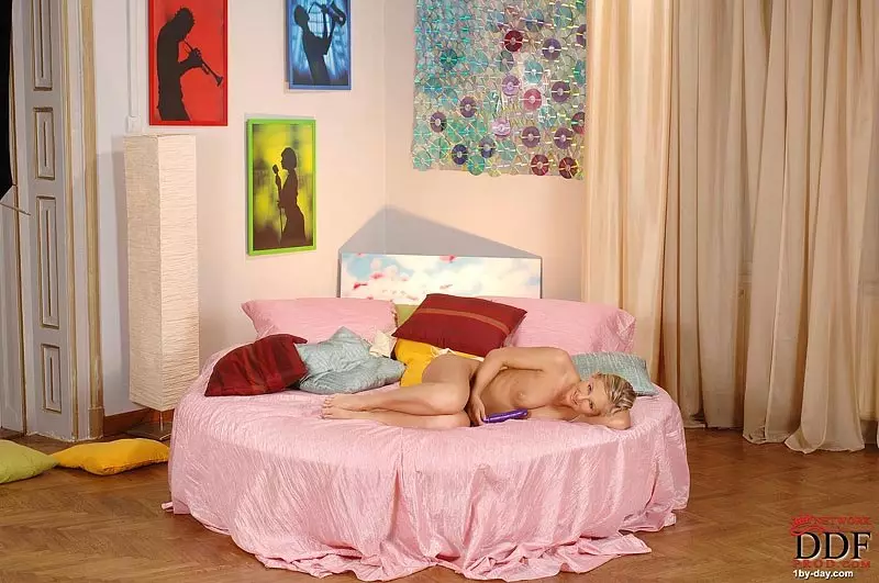 Светловолосая красотка Barbie Night снимает свое нижнее белье и седлает пурпурный самотык на кровати — Barbie Night
