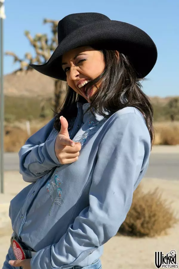 Восхитительная ковбойша Carmen Hart позирует в джинсовой куртке и шляпе, а затем показывает свои великолепные титьки — Carmen Hart